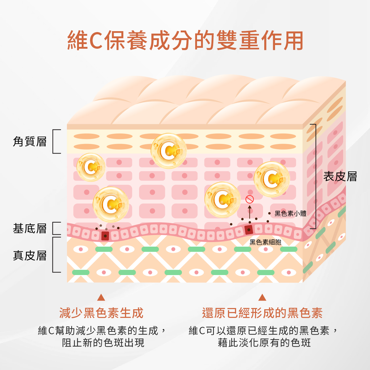 此外,維C還能還原已經形成的黑色素,改善色素沉澱問題,幫助膚色更加均勻。