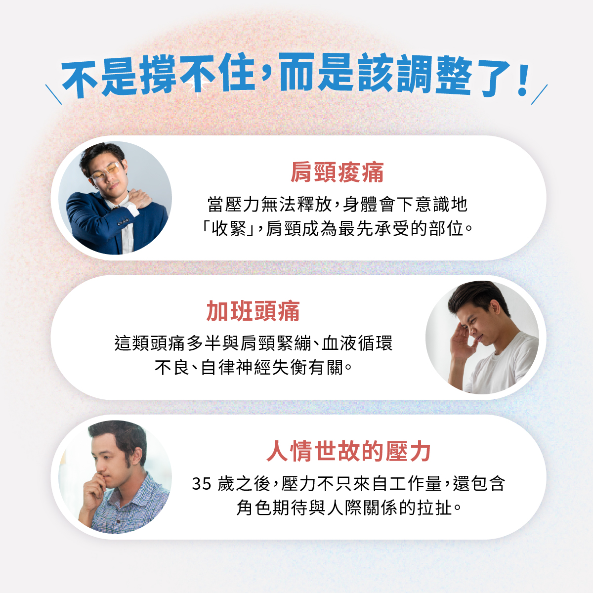 肩頸痠痛、加班型頭痛、夜裡翻來覆去睡不著,這些看似零碎的不適,其實正提醒你:不是撐不住,而是該調整了。